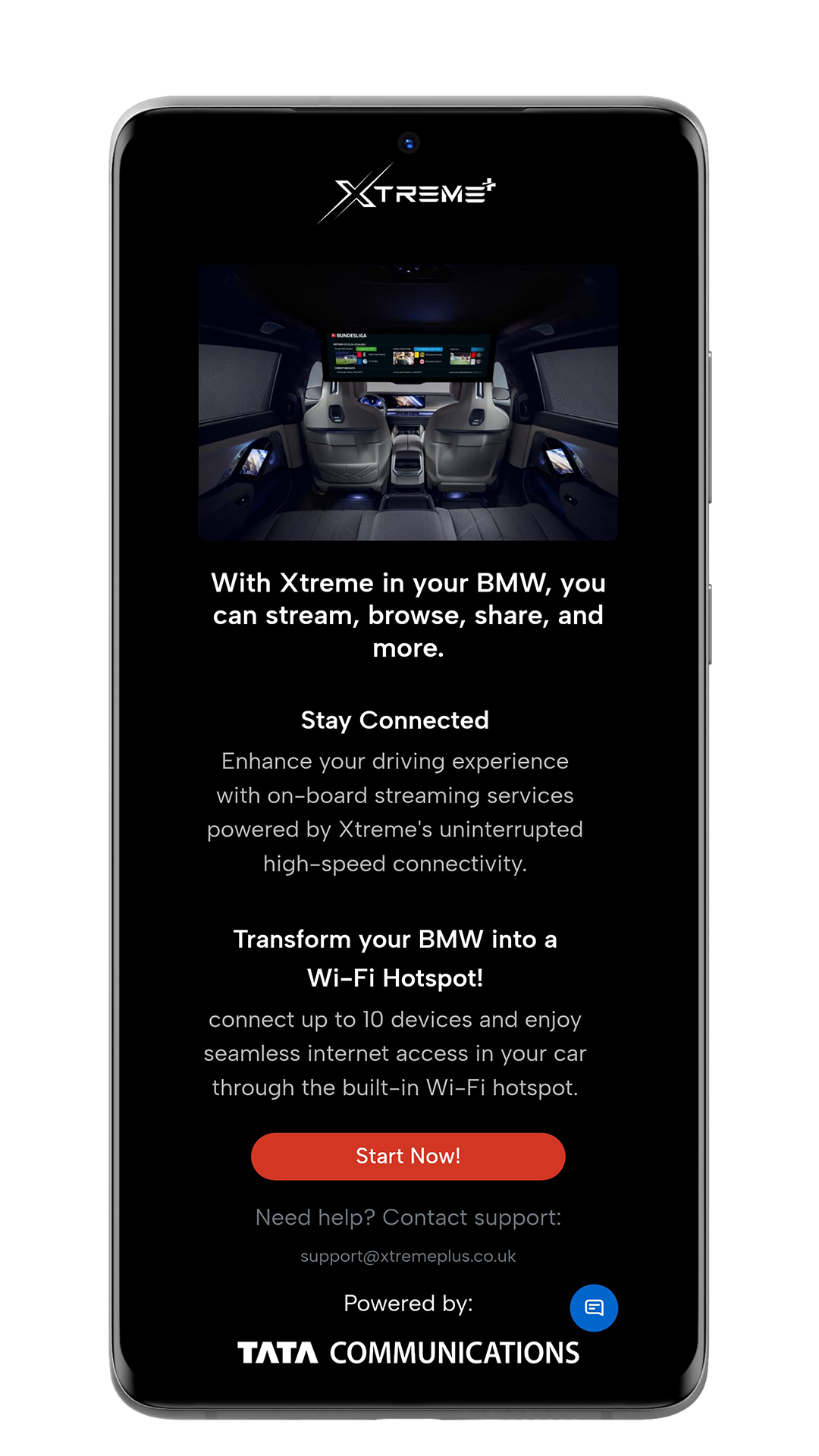 You will be automatically redirected from the My BMW App to car.xtremeplus.co.uk. Please click "Start Now" to proceed.