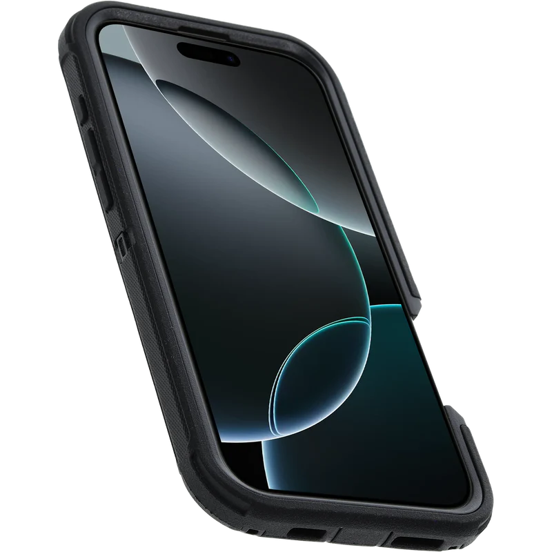 Defender Series for MagSafe delivers peak protection with a tri-layer design: silicone outer cover, rigid inner shell, and memory foam backing work together to absorb shocks and provide 7X military-standard drop defense. Features include reinforced corners, textured grip, integrated MagSafe magnets, and built-in anchors for phone straps. Holster not included.