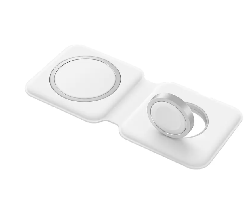 The MagSafe Duo Charger conveniently charges your compatible iPhone, Apple Watch, wireless charging case for AirPods, and other Qi certified devices. Just place your devices on the charger and a steady, efficient charge begins on contact. The charger folds together neatly so you can easily take it with you wherever you go. Phone and watch not included.