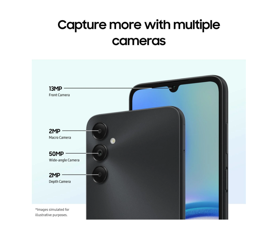 Galaxy A05s has the essentials covered. Affordability and simplicity designed with the latest innovative smartphone features. Delivering a black aesthetic design, a vibrant large screen, incredible camera capabilities and plenty of storage.